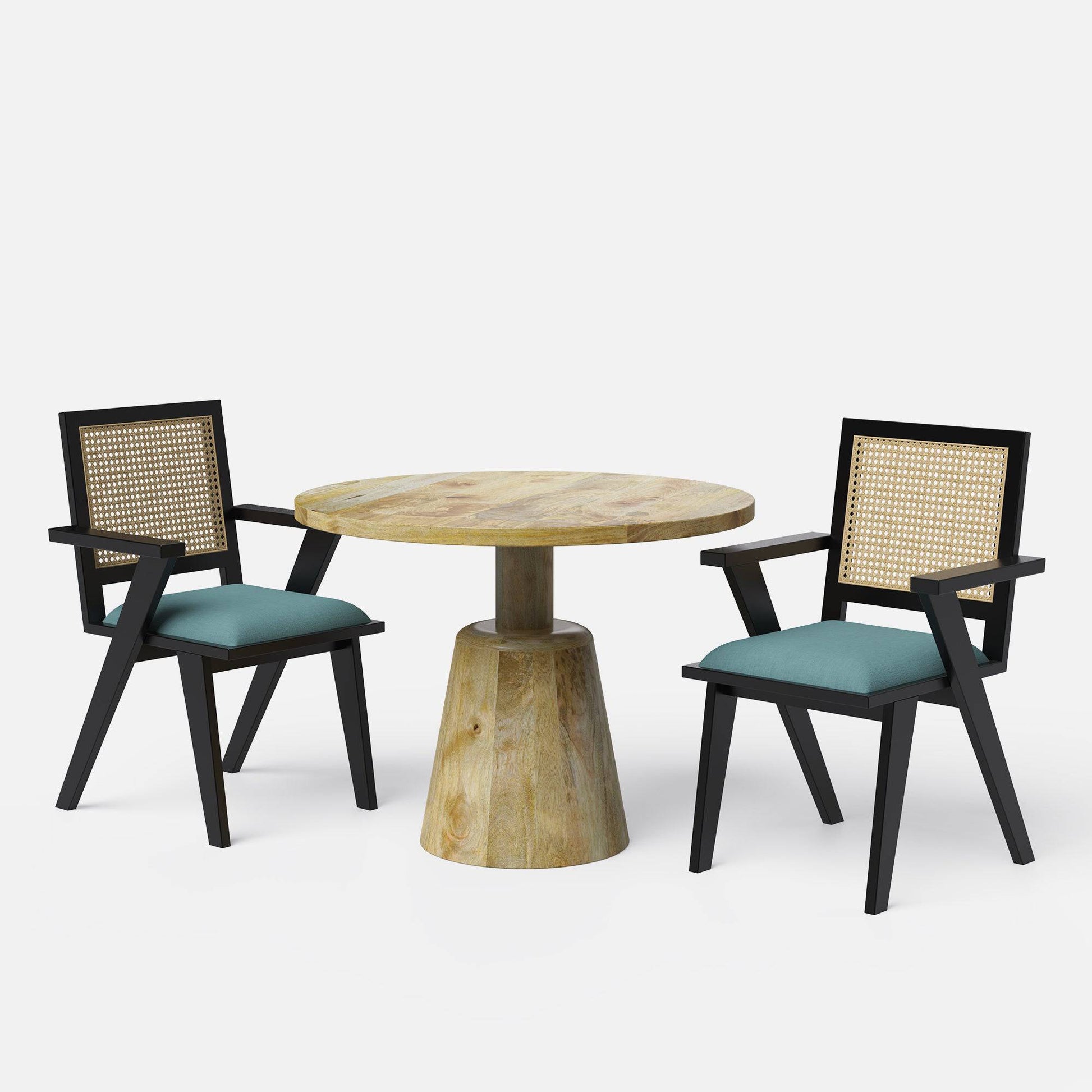 Introducing the Yukon Flora Dining Set, a captivating blend of contemporary design and timeless comfort. Crafted from mango wood, the Yukon table in a Natural finish boasts a pedestal shape, harmonizing perfectly with Flora chairs. Inspired by Pierre Jeanneret's style, the chairs feature upholstered seats in Teal Green Cotton blend fabric. Available in 2, 4, and 6-seater sizes, this set combines modern aesthetics with comfort for a stylish dining experience.
