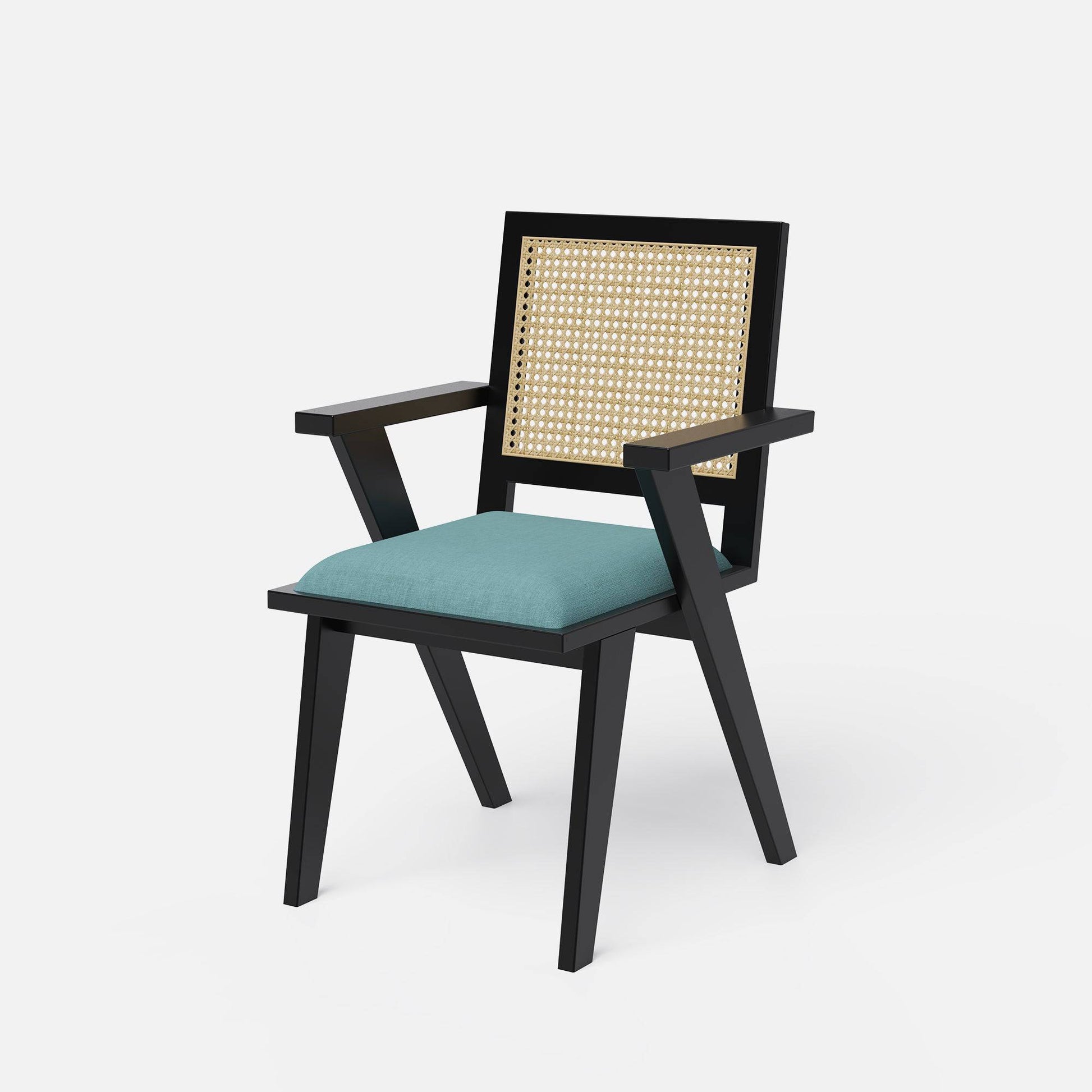 - Flora chairs with Pierre Jeanneret-inspired design and Teal Green Cotton blend fabric seats